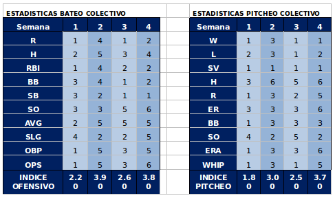 Más abajo dos cuadros con las estadísticas ofensivas y de pitcheo del Licey y sus puntuaciones en las semanas 1, 2, 3 y 4 asi como los llamados INDICES OFENSIVO y de PITCHEO equivalentes a la posición promedio del Licey respecto al resto de la liga en 10 estadísticas ofensivas y 10 estadísticas de pitcheo respectivamente, recordando que mientras más cerca de 1 o más lejos de 6 mejor.