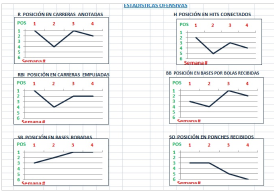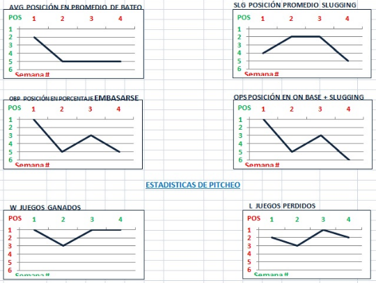 J. Compartimos hoy, como lo haremos cada 4 semanas, las gráficas individuales de las variaciones al final de cada semana de las 10 estadísticas ofensivas y las 10 de pitcheo. Recordar que se trata de posiciones relativas al resto de la liga cortadas después de los juegos de cada domingo y que mientras menor (lugar 2, 1, etc) mejor.