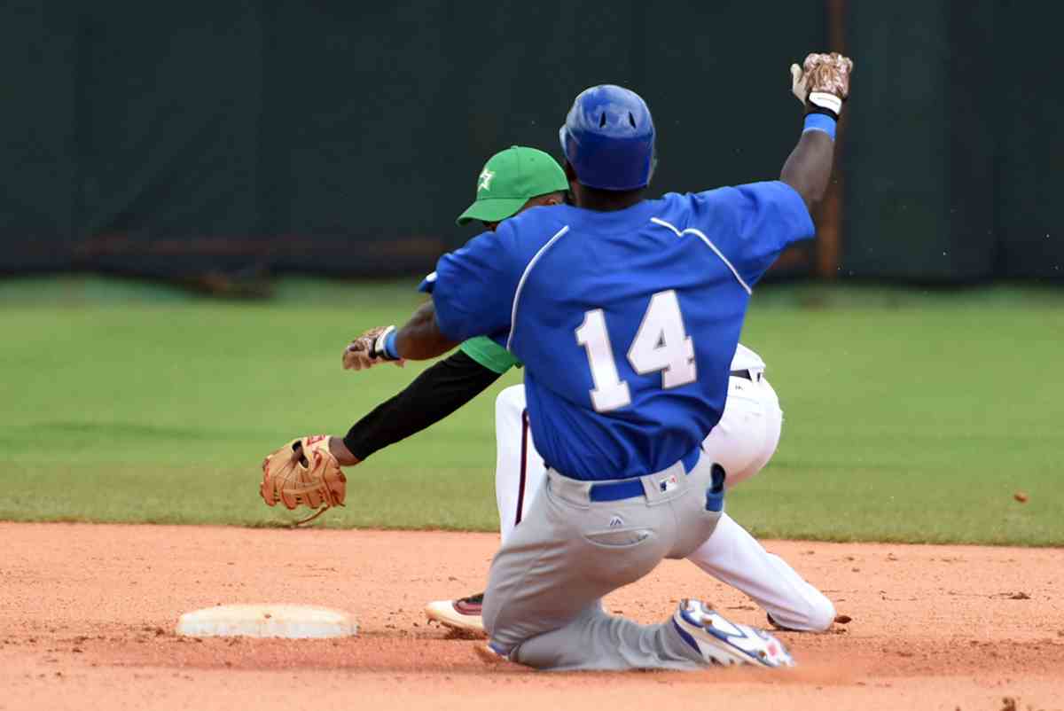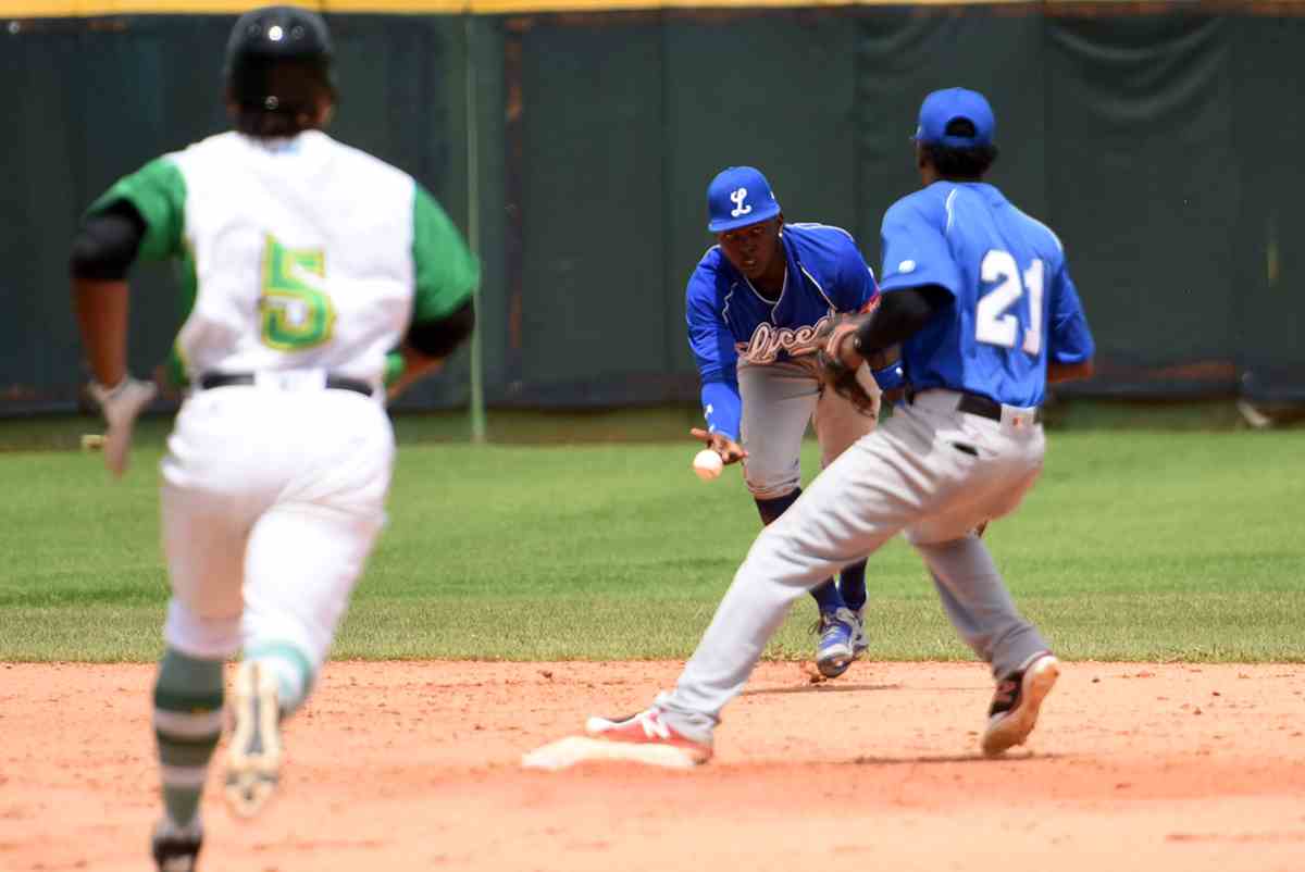 SAN PEDRO DE MACORIS,-El torpedero Michael De León, del Licey, le pasa la pelota a su compañero Osvaldo Abreu y trata de poner fuera al corredor Agustin Tavárez, de las Estrellas, en jugada de la quinta entrada en el primer juego de la pre-temporada dominicana
