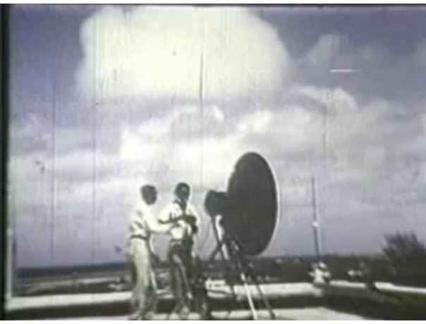 Técnicos conectan la microonda que hizo el enlace con el Canal 4, de donde se transmitió en blanco y negro para los pocos televisores existentes en la ciudad