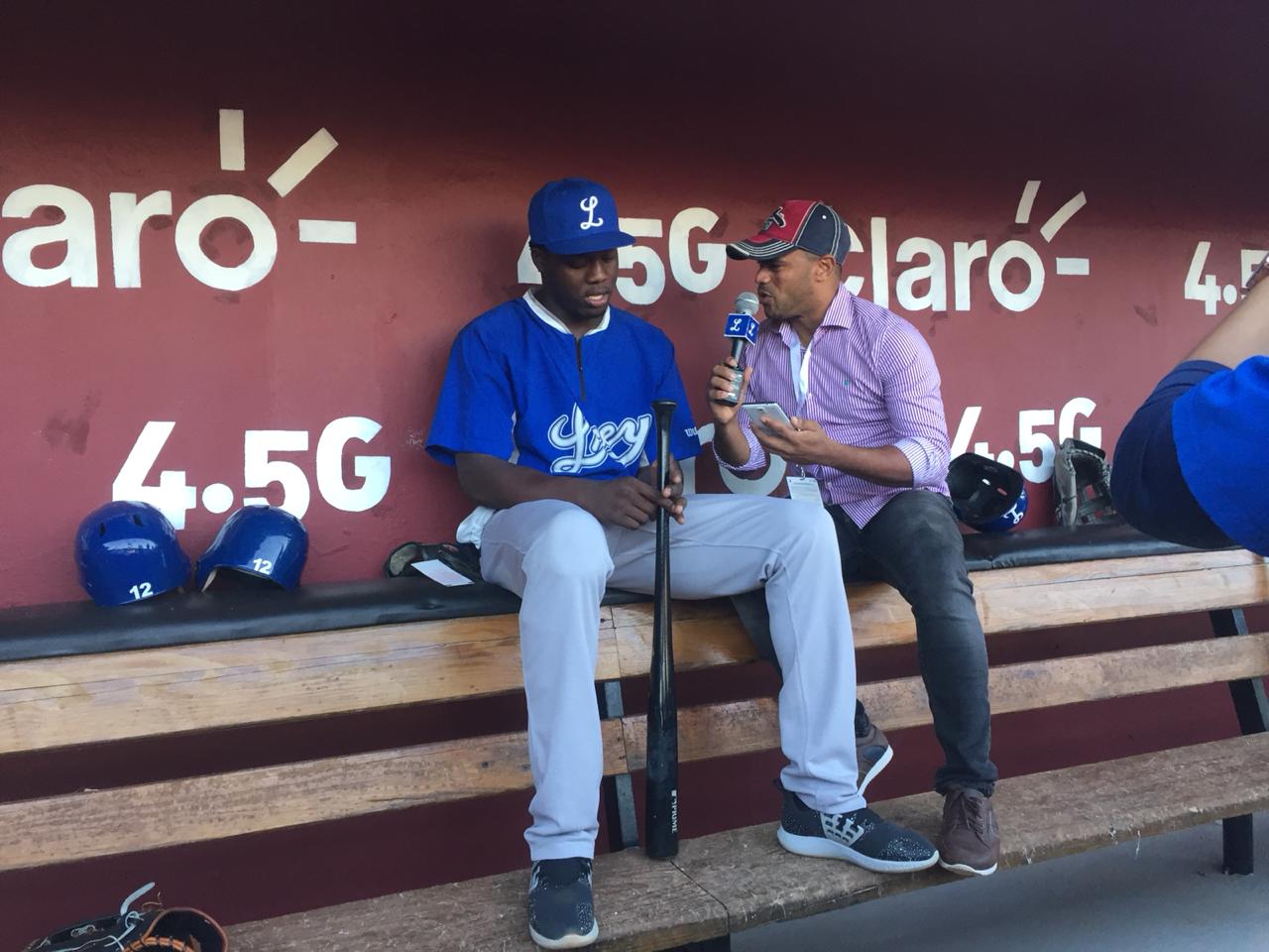 SAN FRANCISCO DE MACORIS,-Aristides Aquino es entrevistado por Juan Carlos Hidalgo para Licey Radio y Tv en el dugout de visitantes del Estadio Julian Javier, hogar de los Gigantes del Cibao