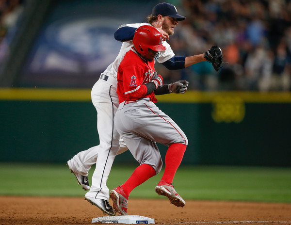 Erick Aybar #2 of the Los Angeles Angels of Anaheim collides with relief pitcher Mark Lowe #57 of the Seattle Mariners who was covering first on a single in the ninth inning at Safeco Field on July 11, 2015 in Seattle, Washington. The Mariners defeated the Angels 5-0.