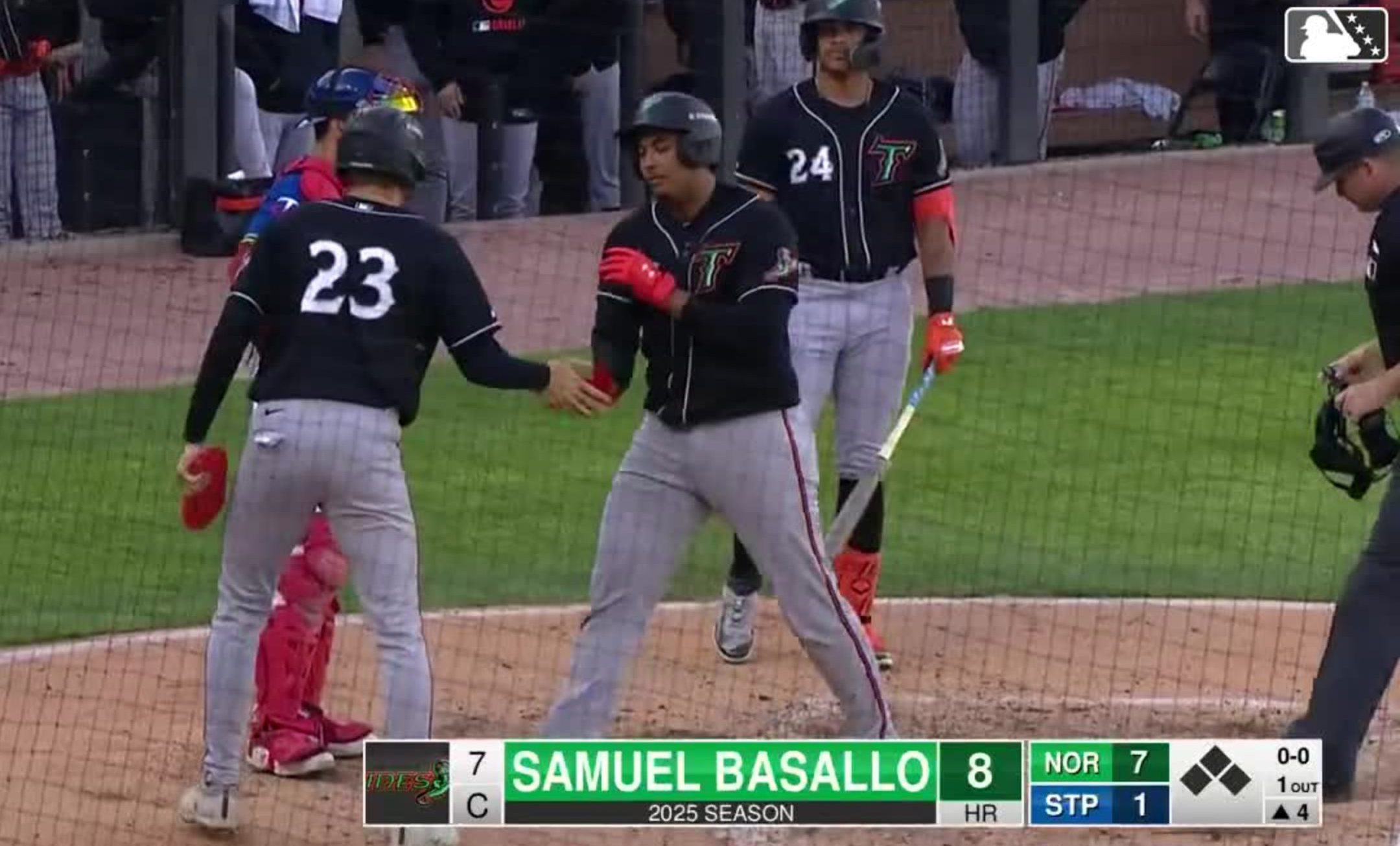 En Triple A, Basallo como receptor y tercer bate, conectó de 3-3 con dos jonrones (9), un doble (5), cuatro anotadas, tres remolcadas (19) y una base por bolas para conducir a Norfolk (Orioles) a vencer 8-3 a St. Paul (Mellizos) en el primer partido de una doble cartelera.