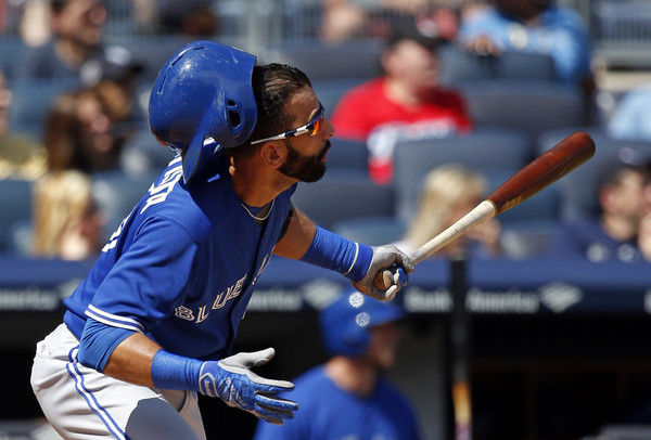 Jose Bautista #19 of the Toronto Blue Jays looses his batting helmet after hitting a double in the first inning against the New York Yankees at Yankee Stadium on September 13, 2015 in the Bronx borough of New York City.