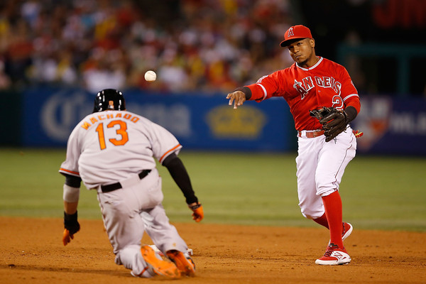 Erick Aybar #2 of the Los Angeles Angels throws to first after getting Manny Machado #13 of the Baltimore Orioles out at second base in the ninth inning at Angel Stadium of Anaheim on August 8, 2015 in Anaheim, California.