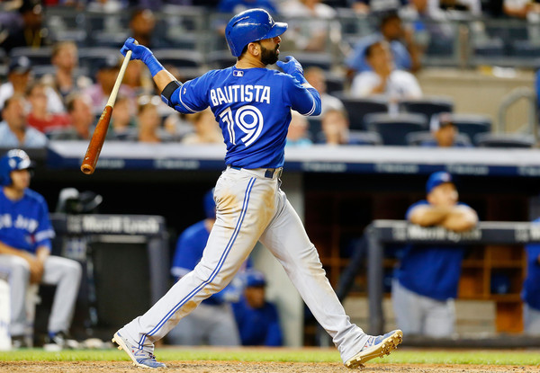 Jose Bautista #19 of the Toronto Blue Jays follows through on his tenth inning home run against the New York Yankees at Yankee Stadium on August 7, 2015 in the Bronx borough of New York City.
