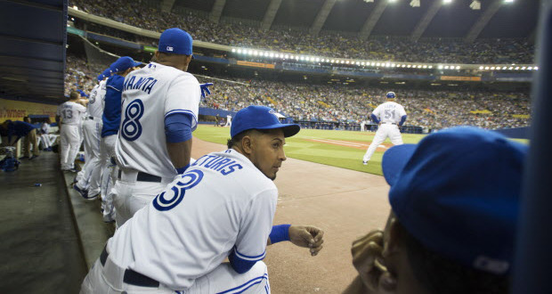 Members of the Blue Jays watch their team face the New York Mets during a pre-season game at the Olympic Stadium Friday, March 28, 2014 in Montreal.