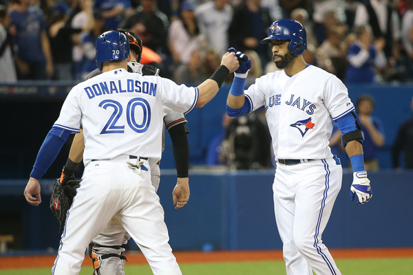 Jose Bautista #19 of the Toronto Blue Jays is congratulated by Josh Donaldson #20 after hitting a two-run home run in the seventh inning during MLB game action against the Baltimore Orioles on April 21, 2015 at Rogers Centre in Toronto, Ontario, Canada. (April 20, 2015 – Source: Tom Szczerbowski/Getty Images North America)