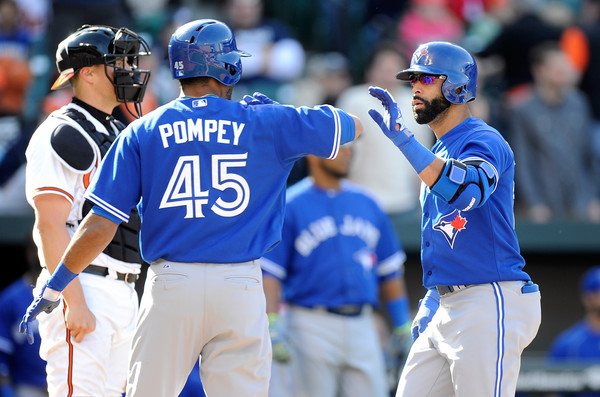 Jose Bautista #19 of the Toronto Blue Jays celebrates with Dalton Pompey #45 after hitting a home run in the eighth inning against the Baltimore Orioles at Oriole Park at Camden Yards on April 12, 2015 in Baltimore, Maryland. (April 11, 2015 – Source: Greg Fiume/Getty Images North America)