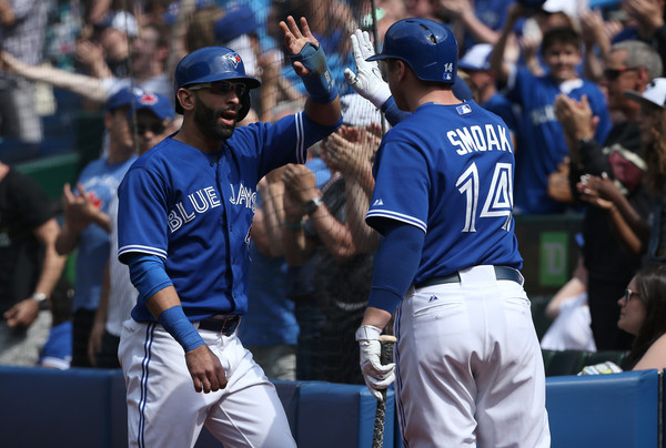 Jose Bautista #19 of the Toronto Blue Jays is congratulated by Justin Smoak #14 after scoring a run in the sixth inning during MLB game action against the Los Angeles Angels of Anaheim on May 18, 2015 at Rogers Centre in Toronto, Ontario, Canada.