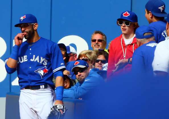 Jose Bautista #19 of the Toronto Blue Jays reacts after a fan (in the red) catches a fly ball in play in the 8th (play was reviewed and call was ruled out) during MLB action at the Rogers Centre September 14, 2014 in Toronto, Ontario, Canada.