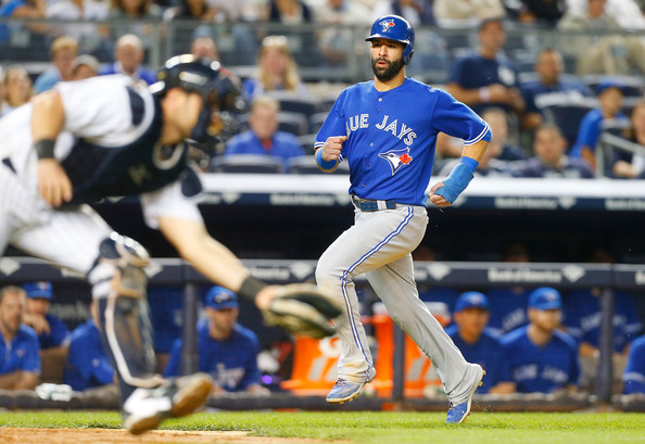 Jose Bautista #19 of the Toronto Blue Jays scores a ninth inning run against the New York Yankees after a base hit from teammate Dioner Navarro (not pictured) at Yankee Stadium on September 20, 2014 in the Bronx borough of New York City.(September 19, 2014 – Source: Jim McIsaac/Getty Images North America)