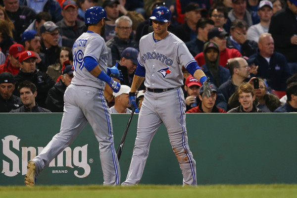 Jose Bautista #19 of the Toronto Blue Jays celebrates with Michael Saunders #21 after scoring a run against the Boston Red Sox during the fourth inning at Fenway Park on April 28, 2015 in Boston, Massachusetts.
