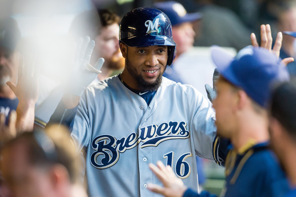 Domingo Santana #16 of the Milwaukee Brewers celebrates after hitting a solo home run during the second inning against the Cleveland Indians at Progressive Field on August 25, 2015 in Cleveland, Ohio.