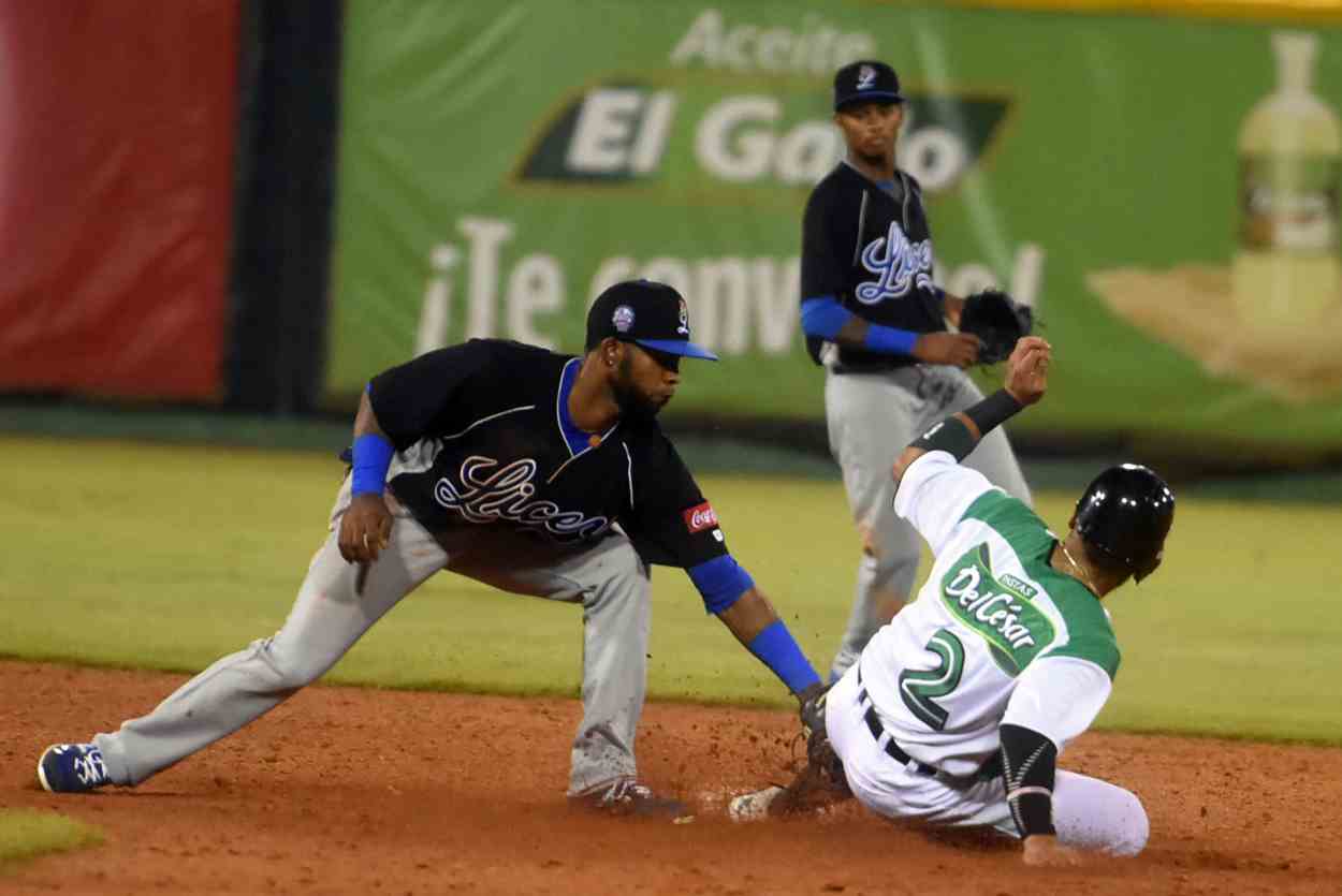 Arismendy Alcántara, del Licey, pone fuera al corredor Gustavo Núñez, de las Estrellas, en la segunda base. Michael De León cruza por detrás