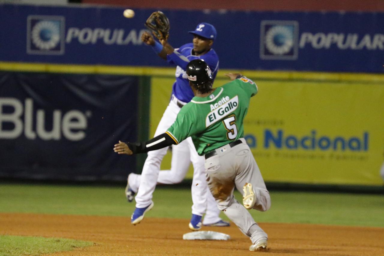 SANTO DOMINGO,-El corredor Aneuy Tavarez, de las Estrellas, es puesto out por el intermedista Pablo Reyes, del Licey, mientras que el torpedero Emmanuel Burris  crusa por detrás de la juagada (Isaac Calvo/Licey.com)