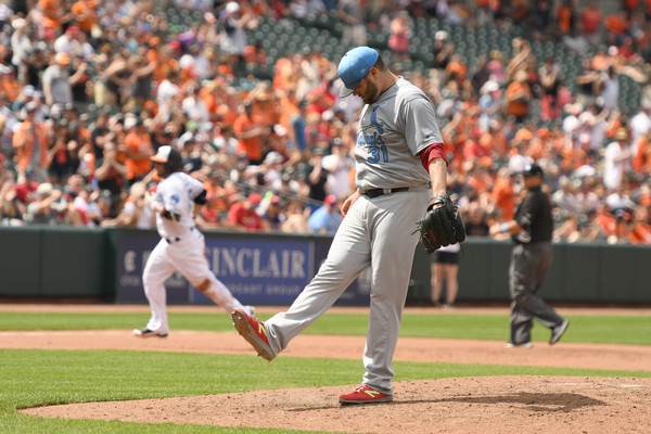 Lance Lynn #31 of the St. Louis Cardinals reacts to a Welington Castillo #29 of the Baltimore Orioles home run in the fifth inning during a baseball game at Oriole Park at Camden Yards on June 18, 2017 in Baltimore, Maryland.