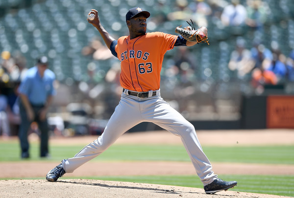 David Paulino #63 of the Houston Astros pitches against the Oakland Athletics in the bottom of the first inning at Oakland Alameda Coliseum on June 22, 2017 in Oakland, California.