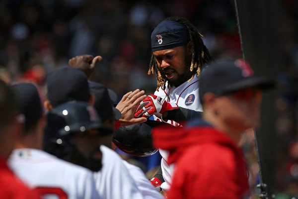 Hanley Ramirez #13 of the Boston Red Sox celebrates after scoring a run in the 2nd inning during the game against the Toronoto Blue Jays at Fenway Park on April 18, 2016.