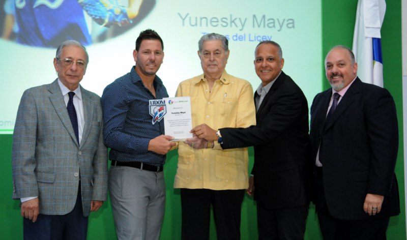 Los acompañaron el manager del glorioso conjunto azul, el puertorriqueño Lino Rivera; el integrante del equipo de Operaciones Fernando José Ravelo Jana y familiares de jugadores, esposa e hijos de Maya, en el acto que encabezaron el vicepresidente de la LiDom, Winston Llenas; y Jorge Besosa, vicepresidente ejecutivo de Banca Empresa del BHD-León, banco del que dijo cumple 10 años aliado al béisbol.
