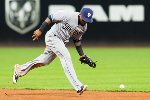 Shortstop Erick Aybar #8 of the San Diego Padres misses a ground ball hit by Lonnie Chisenhall #8 of the Cleveland Indians during the seventh inning at Progressive Field on JULY 6, 2017 in Cleveland, Ohio.