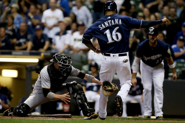 Chris Stewart #19 of the Pittsburgh Pirates tags out Domingo Santana #16 of the Milwaukee Brewers at home plate in the third inning at Miller Park on September 12, 2017 in Milwaukee, Wisconsin.