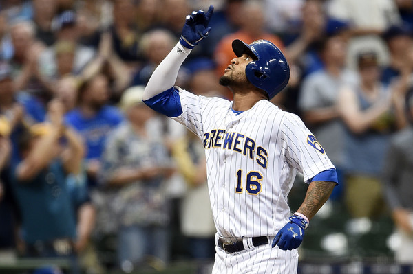 Domingo Santana #16 of the Milwaukee Brewers celebrates a home run during the seventh inning of a game against the Los Angeles Dodgers at Miller Park on June 2, 2017 in Milwaukee, Wisconsin. (June 1, 2017 – Source: Stacy Revere/Getty Images North America)
