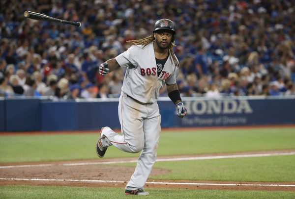 Hanley Ramirez #13 of the Boston Red Sox tosses aside his bat after hitting a solo home run in the fifth inning during MLB game action against the Toronto Blue Jays at Rogers Centre on August 30, 2017 in Toronto, Canada.