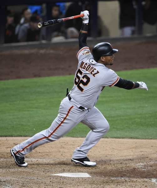 Miguel Gomez #52 of the San Francisco Giants hits a sacrifice fly during the sixth inning of a baseball game against the San Diego Padres at PETCO Park on July 14, 2017 in San Diego, California.(July 13, 2017 – Source: Denis Poroy/Getty Images North America)