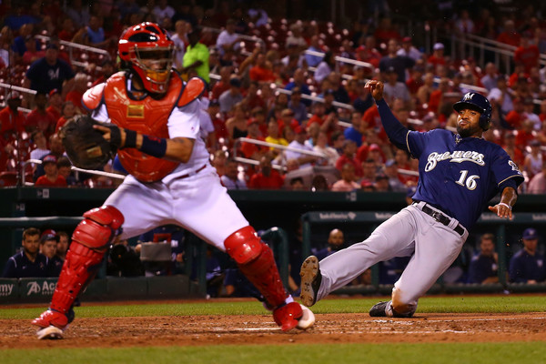 Domingo Santana #16 of the Milwaukee Brewers scores a run against the St. Louis Cardinals in the seventh inning at Busch Stadium on June 14, 2017 in St. Louis, Missouri.(June 13, 2017 – Source: Dilip Vishwanat/Getty Images North America)