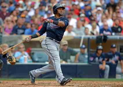 Aug 3, 2014; San Diego, CA, USA; Atlanta Braves infileder Emilio Bonifacio follows through during the eighth inning against the San Diego Padres at Petco Park. Mandatory Credit: Jake Roth-USA TODAY Sports