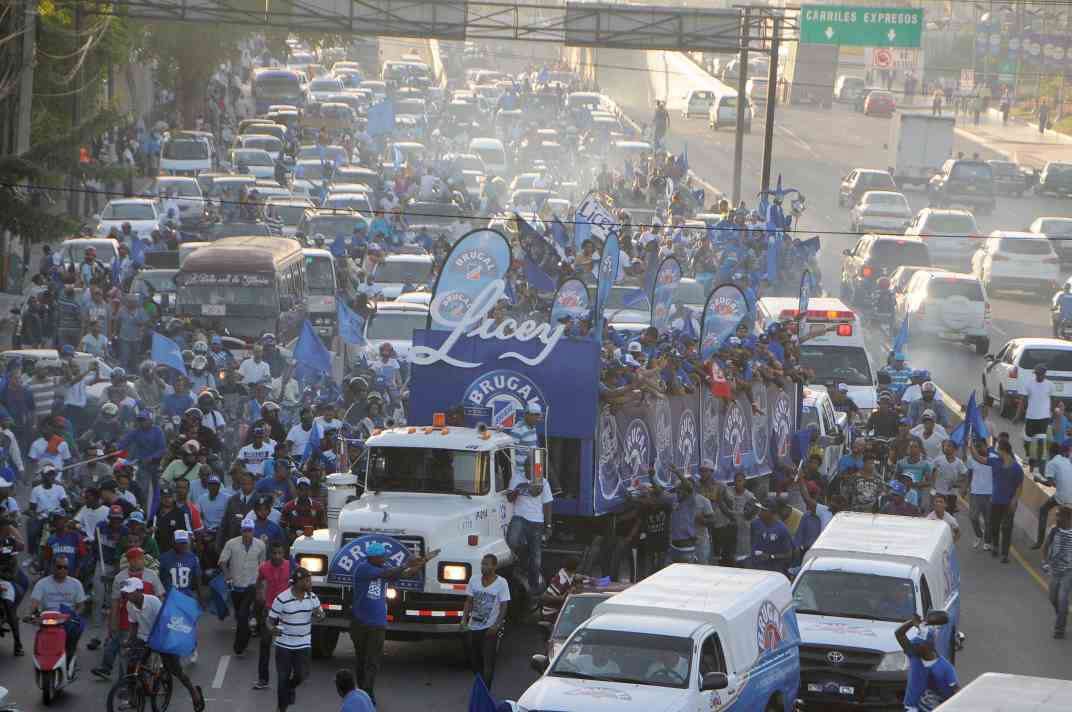 “Y ahora, dónde está papá” y “Licey campeón” fueron los slogans más recurrentes con que el pueblo, entusiasmado, embargado de alegría, coreó al paso de una larga caravana con todo tipo de vehículos, que siguió un gran camión con los jugadores mostrando el trofeo Banco BHD, recibida con un gran bullicio de bocinas, sirenas y un público movilizado en las vías, asomados en puertas, balcones y puentes peatonales, agitando todo tipo de prensas y objetos de color azul.