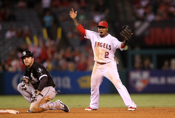 Shortstop Erick Aybar #2 of the Los Angeles Angels of Anaheim reacts as batter Adam LaRoche is called safe at first on his throw after forcing out J.B. Shuck #20 of the Chicago White Sox in the ninth inning at Angel Stadium of Anaheim on August 19, 2015 in Anaheim, California. The call was reversed after video review for the final out of the game to leave a runner at third base. The Angels won 1-0.
