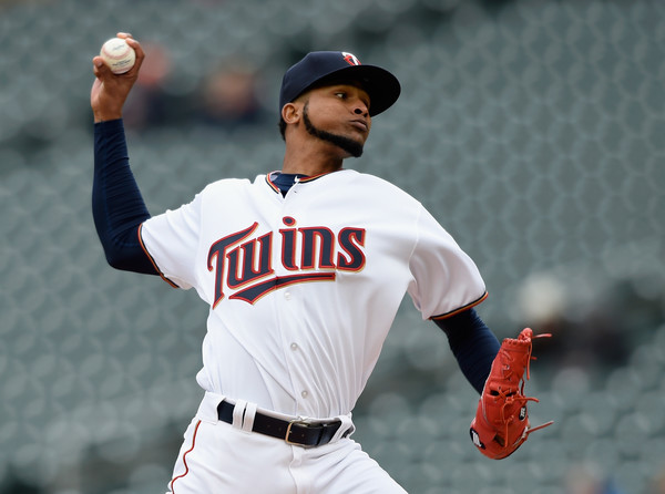 Ervin Santana #54 of the Minnesota Twins delivers a pitch against the Cleveland Indians during the first inning of the game on April 20, 2017 at Target Field in Minneapolis, Minnesota.