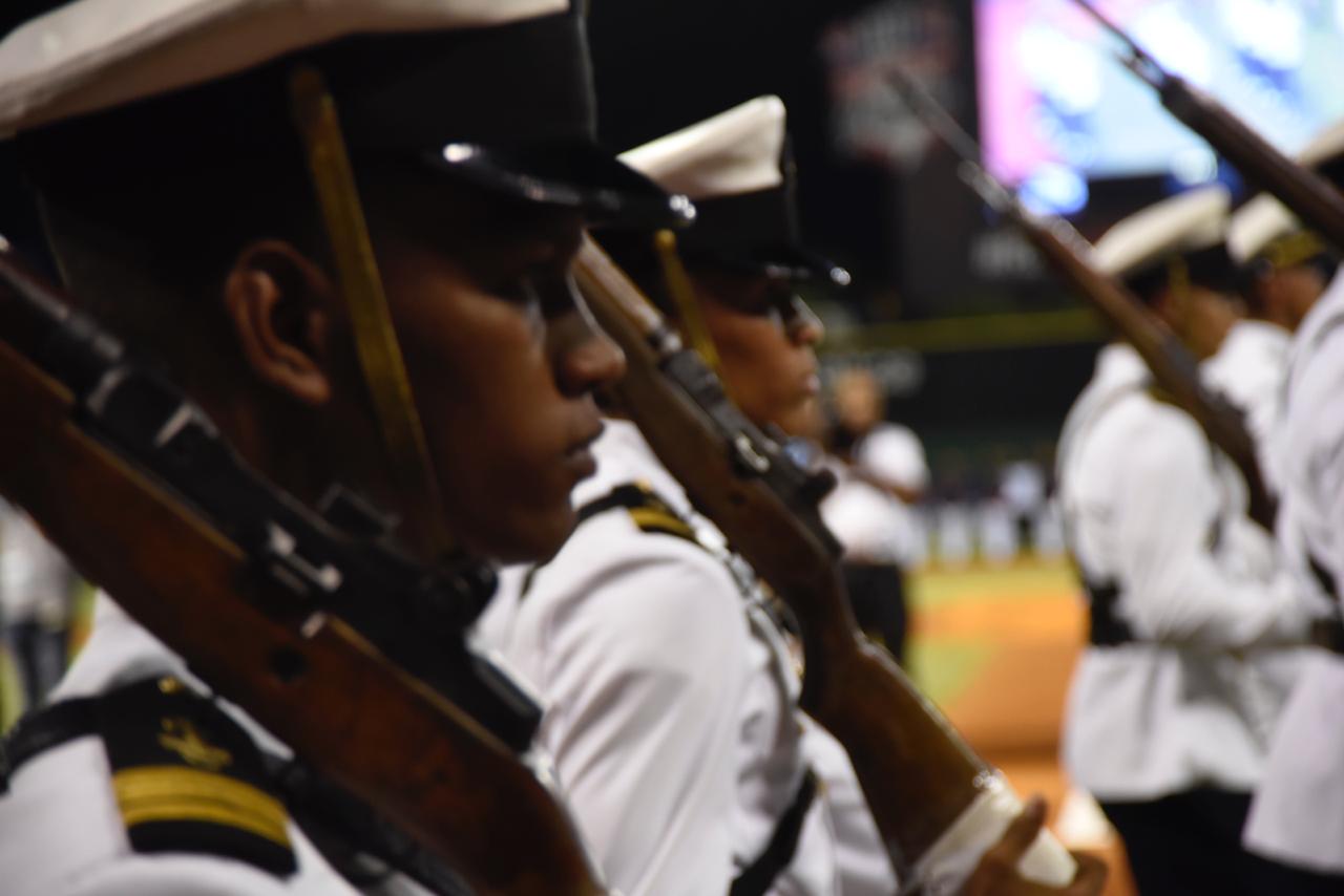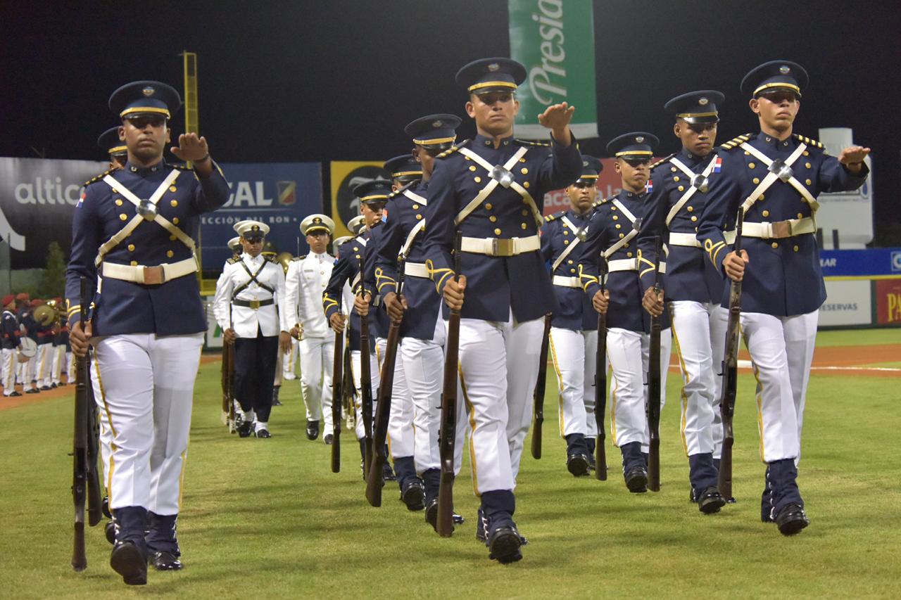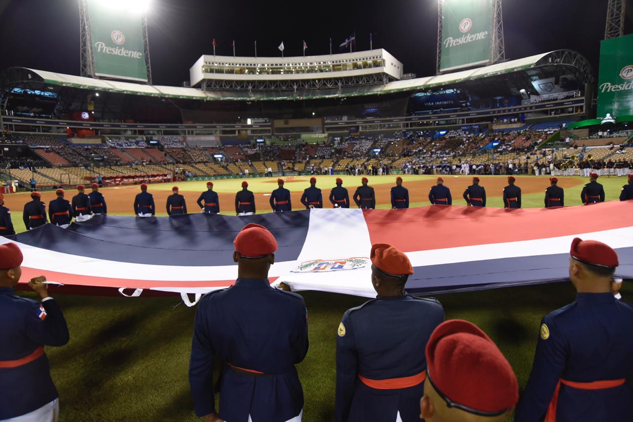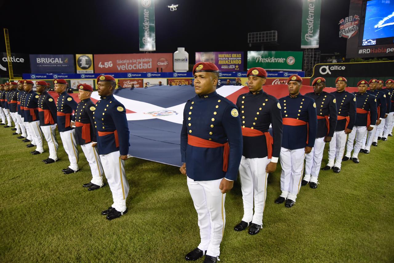 El espectáculo coordinado por la directora de Relaciones Públicas del Licey, periodista Cynthia Morillo y buena animación del maestro de ceremonias, capitán de navío Carlos Rodríguez Medrano, dio paso a la entrada, hasta el centro del campo, de una grande bandera nacional. La sostuvo el regimiento “Guardia de Honor” del Ministerio de Defensa, comandado por el primer teniente del Ejército Morillo Alberto, a los compases de la famosa marcha “El Dragón Volador”, autoría del músico mocano Frank Regino, y que interpretó una gran banda del Ejército.
