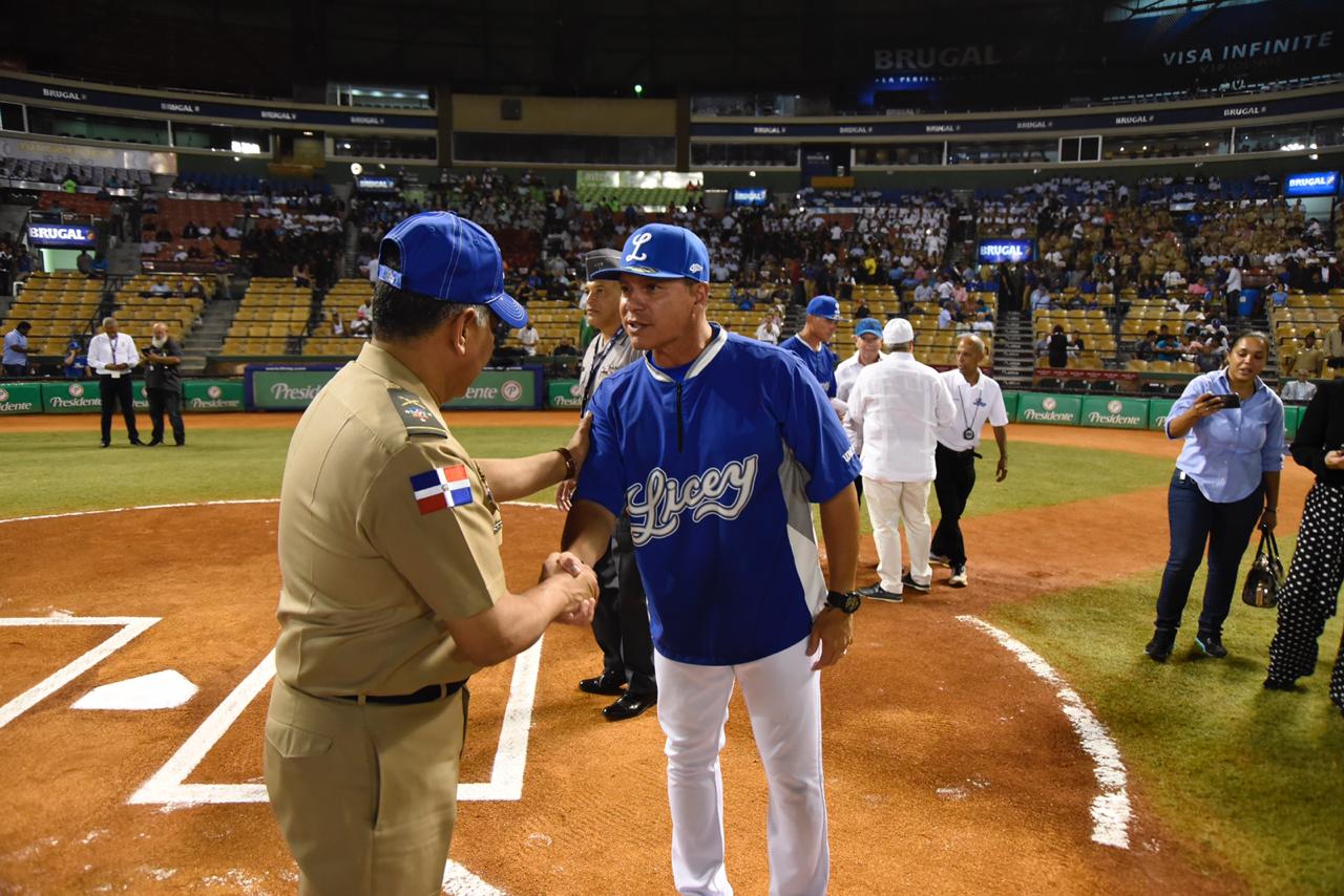 Con los jugadores y coaches del Licey formados por la línea de la tercera base y de las Estrellas por la de primera, el ministro de la Defensa y la comitiva de altos oficiales, acudió a saludarlos, con lo cual concluyó uno de los más regios preámbulos a un partido en que el Club Atlético Licey rindió un homenaje.