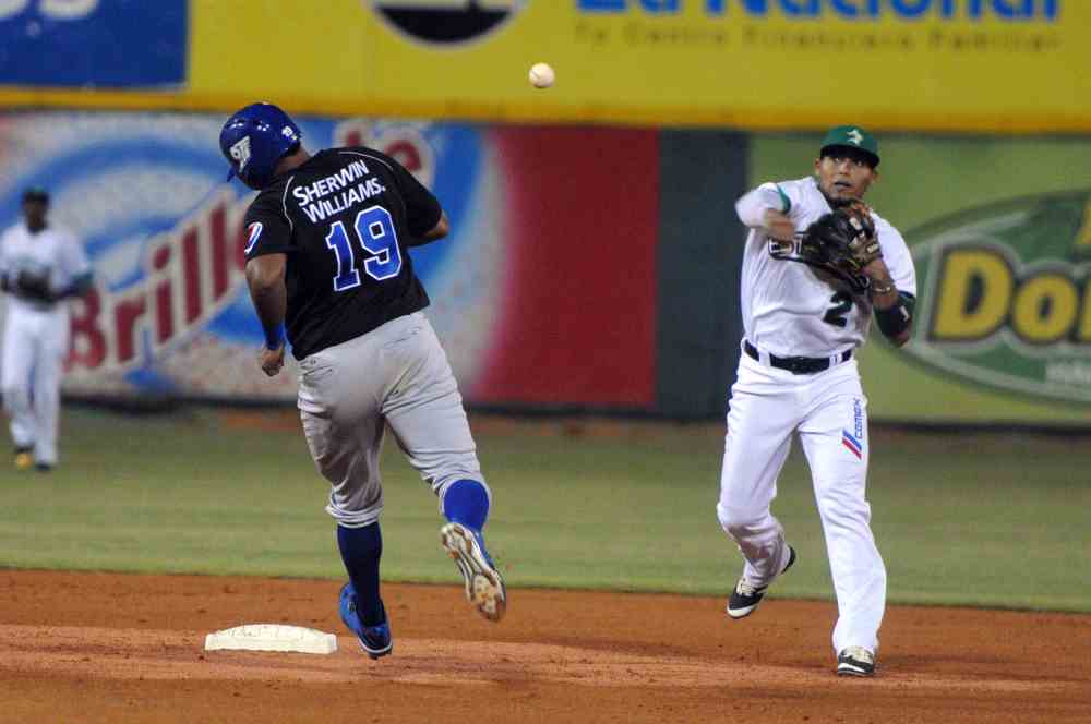 Gustavo Núñez, de las Estrellas, pone fuera al corredor Jorge Bonifacio, del Licey, en la segunda base y completa la doble matanza con el disparo a la inicial en el juego del jueves por la noche en el Estadio Tetélo Vargas.