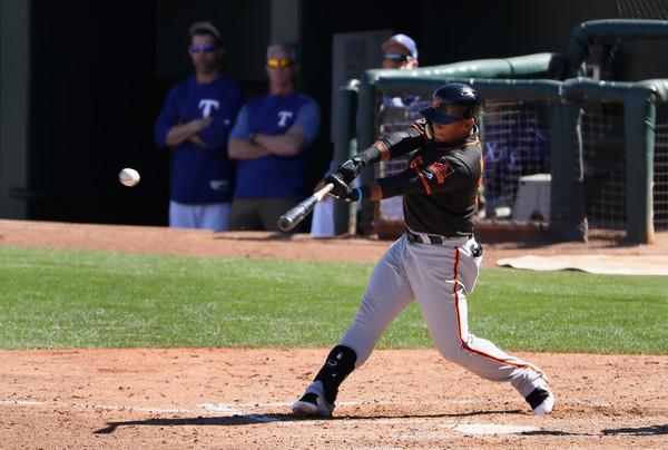 Miguel Gomez #52 of the San Francisco Giants bats against the Texas Rangers during the spring training game at Surprise Stadium on March 5, 2018 in Surprise, Arizona.