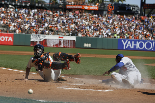 Andrew Susac #34 of the San Francisco Giants look for the ball after colliding at home with Hanley Ramirez #13 of the Los Angeles Dodgers during the second inning of their game on September 14, 2014 at AT&T Park in San Francisco, California