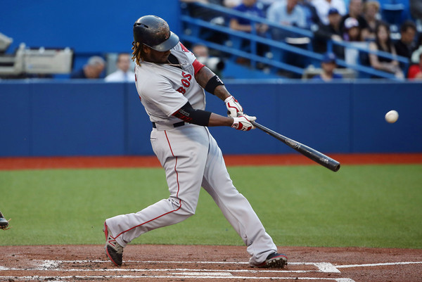 Hanley Ramirez #13 of the Boston Red Sox hits a solo home run in the first inning during MLB game action against the Toronto Blue Jays on July 2, 2015 at Rogers Centre in Toronto, Ontario, Canada.