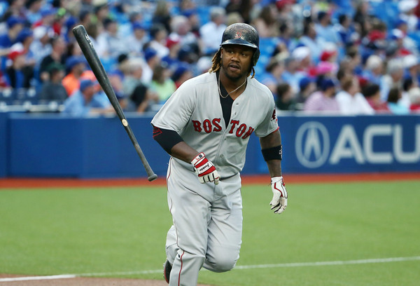 Hanley Ramirez #13 of the Boston Red Sox flips his bat after hitting a solo home run in the first inning during MLB game action against the Toronto Blue Jays on July 2, 2015 at Rogers Centre in Toronto, Ontario, Canada.