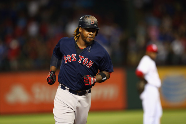 Hanley Ramirez #13 of the Boston Red Sox runs the bases after his two-run homerun against the Texas Rangers in the eighth inning at Globe Life Park in Arlington on May 29, 2015 in Arlington, Texas.