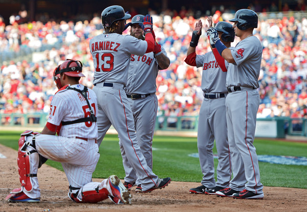 Carlos Ruiz #51 of the Philadelphia Phillies kneels as Hanley Ramirez #13 of the Boston Red Sox gets congratulated by teammates Mike Napoli #12, Mookie Betts #50 and Allen Craig #5, after hitting a grand slam against the Philadelphia Phillies during Opening Day at Citizens Bank Park on April 6, 2015 in Philadelphia, Pennsylvania. The Red Sox won 8-0.(April 5, 2015 – Source: Drew Hallowell/Getty Images North America)