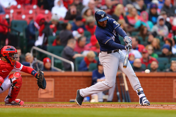 Domingo Santana #16 of the Milwaukee Brewers hits an RBI single against the St. Louis Cardinals in the second inning at Busch Stadium on April 9, 2018 in St. Louis, Missouri.
