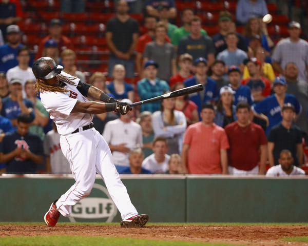 Hanley Ramirez #13 of the Boston Red Sox hits a single in the bottom of the nineteenth inning to win the game against the Toronto Blue Jays at Fenway Park on September 5, 2017 in Boston, Massachusetts.