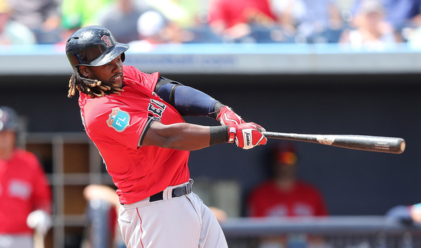 Hanley Ramirez #13 of the Boston Red Sox doubles to right field scoring Tzu-Wei Lin (not in photo) during the seventh inning of the Spring Training Game against the Tampa Bay Rays on March 30, 2016 at the Charlotte Sports Park, Port Charlotte, Florida. The Rays defeated the Red Sox 4-3. (March 29, 2016 – Source: Leon Halip/Getty Images North America)