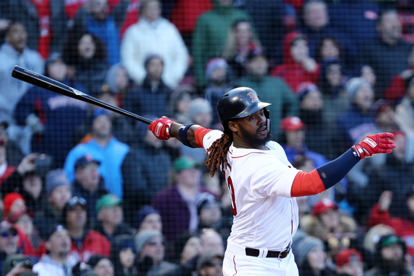 Hanley Ramirez #13 of the Boston Red Sox celebrates after hitting a walk off single, driving in Jackie Bradley Jr. #19, during the twelfth inning of the Red Sox home opening game against the Tampa Bay Rays at Fenway Park on April 5, 2018 in Boston, Massachusetts.