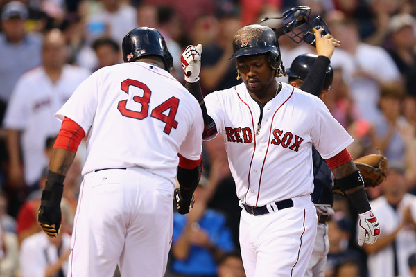 David Ortiz #34 of the Boston Red Sox congratulates Hanley Ramirez #13 after he hit a two run homer during the fourth inning against the New York Yankees at Fenway Park on July 11, 2015 in Boston, Massachusetts.