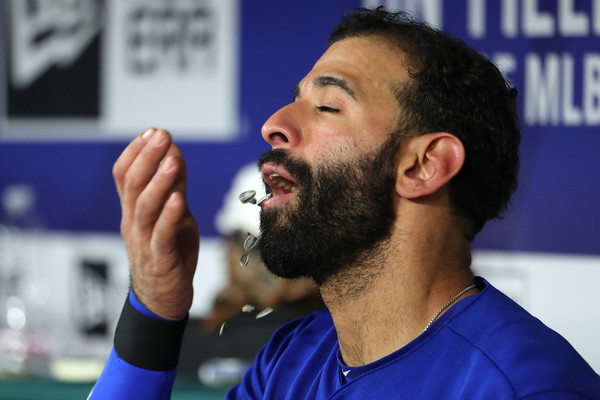 Jose Bautista #19 of the Toronto Blue Jays eats sunflower seeds as the Toronto Blue Jays take on the Texas Rangers in the top of the fourth inning at Globe Life Park in Arlington on June 21, 2017 in Arlington, Texas.