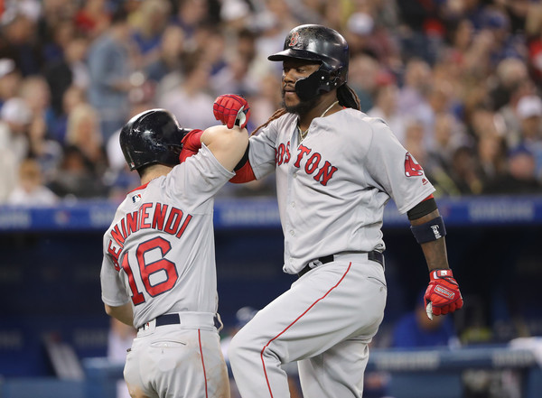 Hanley Ramirez #13 of the Boston Red Sox is congratulated by Andrew Benintendi #16 after hitting a two-run home run in the third inning during MLB game action against the Toronto Blue Jays at Rogers Centre on May 12, 2018 in Toronto, Canada.(May 11, 2018 – Source: Tom Szczerbowski/Getty Images North America)